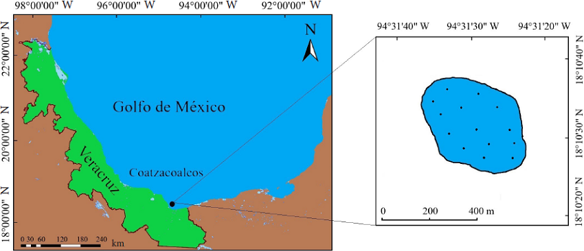 Palo Seco se ubica a los 18°10’30” N y 94°31’30” W, a 1 920 m de la costa de Coatzacoalcos, Veracruz, y cubre un área aproximada de 0.12 km2 (Figura 1). Presenta una profundidad que oscila de 11.6 m a 22 m, su estructura arrecifal contiene varios parches con baja cobertura coralina representada por Pseudodiploria sp, Montastraea sp, Siderastrea sp, Agaricia sp y Oculina sp. Las pendientes rocosas contienen numerosas colonias de esponjas e hidroides (González-Gándara y col., 2015). Esta formación es bañada por el río Coatzacoalcos cuyo gasto en época de lluvias es de 661.44 m3/s, y su temperatura promedio es de 25.39 °C (Salas-Pérez y col., 2015).