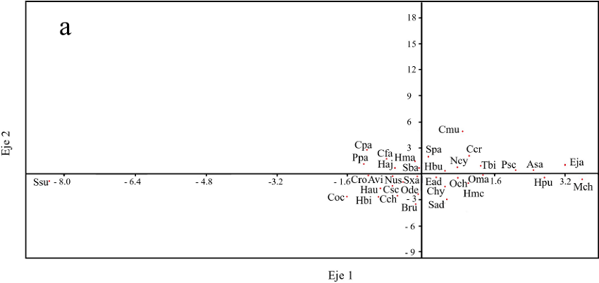 Entre los GMF que caracterizan al sustrato del arrecife Palo Seco destacaron: algas césped, esponjas, roca, corales y cianobacterias (Tabla 7). En el análisis de ACC, el eje 1 mostró una relación con la proporción de esponjas y de arena. En cambio, en el eje 2 se detectó un gradiente de la profundidad y las algas césped, que se relacionan negativamente con la cobertura coralina, de algas costrosas y roca (Figura 2b). Los eigenvalores fueron relativamente bajos (Tabla 8), pero se puede detectar una tendencia en la distribución de las especies de peces en función de la profundidad y la cobertura coralina principalmente. De esta forma, en las áreas someras con mayor cobertura coralina, fueron más frecuentes: Microspathodon chrysurus, Abudefduf saxatilis, Elacatinus jarocho, Hypoplectrus puella y Ophioblennius macclurei, entre otros, mientras que en las zonas profundas con mayor cobertura de algas césped, fueron comunes: Serranus subligarius, Chaetodon ocellatus y Pomacanthus paru (Figura 2a, 2b). Los primeros dos ejes del ACC del GMF y abundancia de peces explicaron el 51.86 % de la variación (Tabla 8).