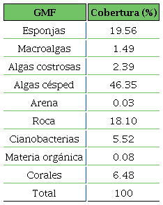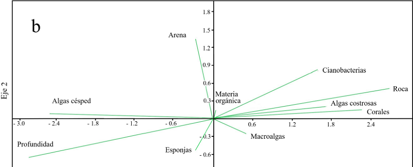 Los componentes bentónicos fueron determinados usando los siguientes grupos morfofuncionales: algas césped, algas costrosas, cianobacterias, corales, esponjas, macroalgas, arena, materia orgánica y roca, definidos a partir de 1 470 fotografías tomadas sobre los transectos de 25 m x 2 m con una cámara Canon, Power Shot G16 de 16 megapíxeles (Tokio, Japón). Las imágenes fueron analizadas con el programa Coral Point Count (Kohler y Gill, 2006), usando 25 puntos al azar por imagen. Para el análisis de correspondencia canónica (ACC), se utilizó la matriz de cobertura de los grupos morfofuncionales y la profundidad, previa transformación a Box Cox, contra la matriz de las especies de peces más abundantes (transformadas a raíz cuarta) y la matriz de los gremios tróficos de peces, utilizando el programa PAST versión 3.25 (Hammer y col., 2001).