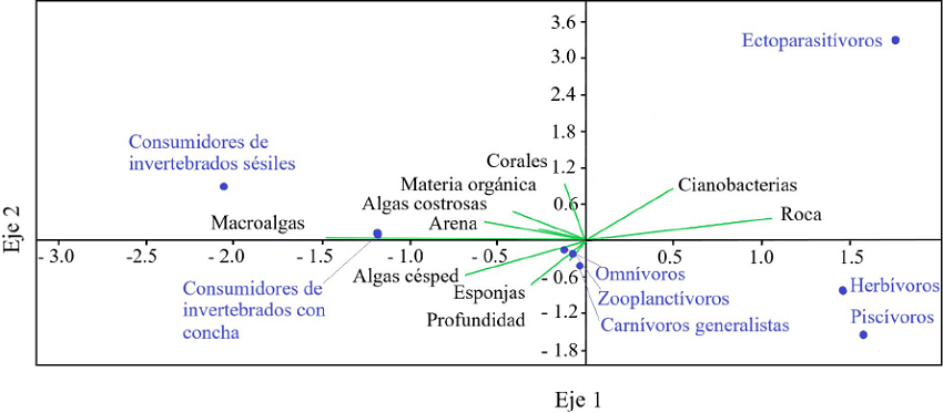 El ACC entre GMF y gremios tróficos provee una limitada descripción de la interrelación, y la mayor parte de las variables ambientales se ligan al eje 1, que refleja la relación de los herbívoros con la presencia de roca y cianobacterias, a pesar de que este grupo trófico fue escaso, posiblemente debido a la disminución de la penetración de luz, característica de los sistemas con alta turbidez (Cheal y col., 2013; Fabricius y col., 2014). Por su parte, los peces que se alimentan de invertebrados con concha y de invertebrados sésiles, se ubicaron en las zonas de arena donde hurgan en el sedimento o bien en las zonas de mayor proporción de vegetación (macroalgas, algas césped), donde se localizan anélidos, moluscos y crustáceos, que utilizan como alimento (Randall, 1967). Los peces piscívoros no muestran relación clara con el ambiente, porque la mayor parte de ellos son transeúntes de la columna de agua (M. atlanticus y S. barracuda), y sugiere una mayor adaptación de estos a las condiciones de turbidez para detectar a sus presas (Huber y Rylander, 1992).