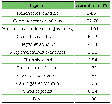 Las especies de peces más abundantes en Palo Seco coinciden con aquellas registradas por González-Gándara y González-Sansón (1997), para el arrecife Tuxpan, y Pérez-España y col. (2015) para el SAV. Entre las 10 especies más abundantes en Palo Seco, destaca N. cyanomos, lo cual sugiere el establecimiento definitivo de esta especie en la región, hecho que puede influir en la estructura comunitaria, aunque esta aseveración requiere de estudios poblacionales detallados. Uno de los grupos de peces más abundantes corresponde a los territoriales (e. g. Stegastes adustus y Stegastes xanthurus, posiblemente por su capacidad para controlar los niveles de sedimentación en sus territorios, ya que al remover las partículas aseguran el crecimiento de las algas que prefieren (Ceccarelli y col., 2005 y Dromard y col., 2018). La ausencia de Stegastes planifrons en el área estudiada, parece relacionarse con la escasez de refugios, especialmente porque esta damisela se le ha asociado a colonias de los géneros Orbicella o Acropora (Tolimieri, 1998; González-Gándara y Arias-González, 2004, Dromard y col., 2018), los cuales prácticamente no existen en el sistema Palo Seco.
