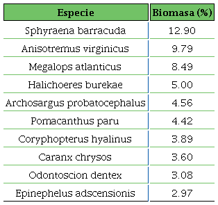 Se contabilizaron un total de 26 192 individuos, por lo que, la abundancia promedio de peces por censo fue de 485 ± 148 ind, y entre las especies más abundantes destacan aquellas de talla menor a 10 cm, como: H. burekae, Coryphopterus hyalinus y los juveniles de Haemulon aurolineatum que representaron más del 70 % del total (Tabla 3). La prueba t para la estimación de tallas, no mostró diferencias significativas (t = 0.21, P = 0.832). Se estimó una biomasa total de 10 194.05 g durante la investigación, por tanto, el promedio de la biomasa ictiológica fue de 188.77 ± 169.22 g/m2 por censo. Las especies con mayor biomasa fueron: Sphyraena barracuda, Anisotremus virginicus y Megalops atlanticus, representando un poco más del 30 % (Tabla 4).