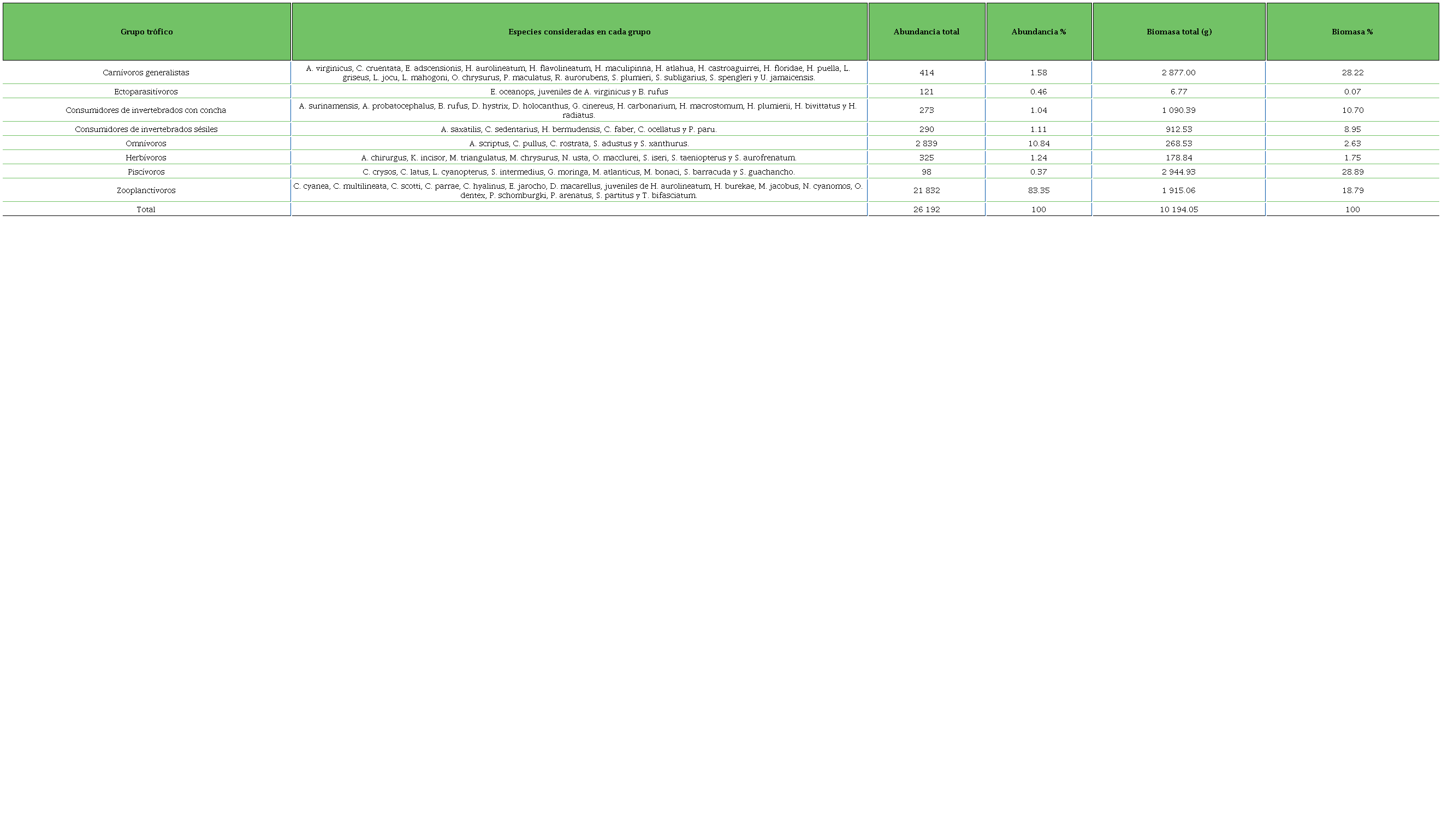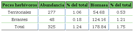 Los peces que se alimentan de zooplancton (e. g. H. burekae, C. hyalinus y juveniles de H. aurolineatum) constituyeron el gremio dominante en el arrecife Palo Seco, representando el 83.35 % del total de la abundancia, seguido de los omnívoros (10.84 %) y carnívoros generalistas (1.58 %). Al considerar la biomasa, los zooplanctívoros aportaron el 18.79 %, y los piscívoros (e. g. M. atlanticus) junto con los carnívoros generalistas (e. g. Lutjanus jocu) aportaron el 57.11 % al total, debido a que sus tallas, en general, fueron mayores a 20 cm. La proporción de herbívoros en el arrecife Palo Seco fue notablemente reducida tanto en abundancia total (1.24 %) como en biomasa total (1.75 %) (Tabla 5), especialmente por la escasa abundancia de herbívoros errantes (escáridos, acantúridos y kifósidos), que representaron el 0.18 % de la abundancia total de herbívoros y el 1.21 % de la biomasa total de este gremio (Tabla 6).