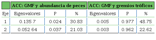 El ACC no dejó evidencias claras de la relación de la comunidad de peces y los GMF en el arrecife Palo Seco, dado que los eigenvalores son bajos, y los primeros dos ejes explican únicamente el 51.86 % de la variación. Sin embargo se nota, que algunas especies territoriales, como M. chrysurus y O. macclurei se ligan a las zonas someras, donde la roca, algas costrosas, corales y cianobacterias fueron más abundantes, y otras (e. g. S. subligarius y C. ocellatus) se asociaron a las zonas profundas, con menor cobertura coralina y alta proporción de algas césped. La cobertura coralina (6.48 %) del arrecife Palo Seco, sugiere una limitada penetración de luz, debido a los sedimentos suspendidos (observación personal) y a la profundidad (Wenger y col., 2015b) pero al parecer, no es determinante en la riqueza y abundancia de peces en Palo Seco.