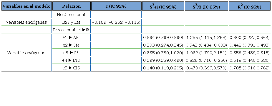 Siguiendo a Byrne (2016) y Kline (2016), se consideró que el ajuste del modelo a los datos es bueno, al mantenerse la hipótesis nula de bondad de ajuste por la prueba chi-cuadrado, con una probabilidad > 0.05 en un contraste a 2 colas (P para χ2); un valor chi-cuadrado relativo (χ2/gl) < 2; una probabilidad > 0.05 por el procedimiento de muestreo repetitivo de Bollen y Stine (1993) (P de BS) con la simulación de 2 000 muestras; valores > 0.95 en el índice de bondad de ajuste (GFI, por sus siglas en inglés: Goodness of Fit Index), índice normado de ajuste (NFI, por sus siglas en inglés: Normed Fit Index), índice incremental de ajuste (IFI, por sus siglas en inglés: Incremental Fit Index) e índice comparativo de ajuste (CFI, por sus siglas en inglés: Comparative Fit Index); un valor < 0.90 en el índice de bondad de ajuste corregido (AGFI, por sus siglas en inglés: Adjusted Goodness of Fit Index), así como valores < 0.05 en el error de aproximación cuadrático medio (RMSEA, por sus siglas en inglés: Root Mean Square Error of Approximation) y el residuo estandarizado cuadrático medio (SRMR, por sus siglas en inglés: Standarized Root Mean Square Residual). Se valoró el ajuste como aceptable con P para χ2 > 0.01; χ2/gl < 3; P de BS > 0.01; GFI, NFI, IFI y CFI > 0.90; AGFI > 0.85; RMSEA < 0.08 y SRMR < 0.10.