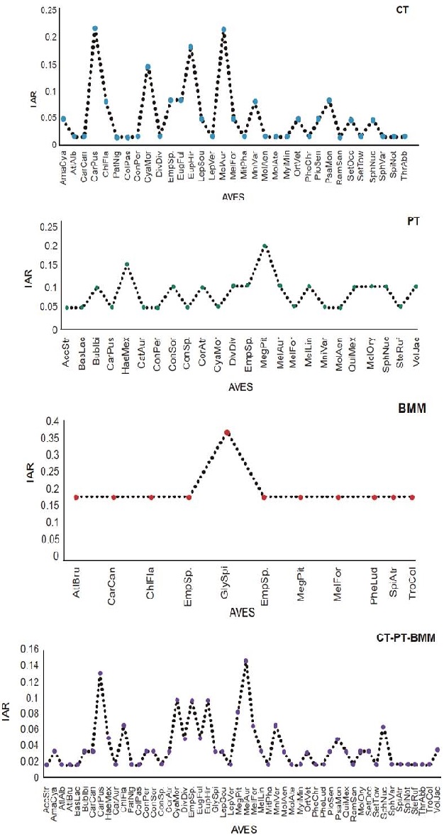 Los resultados del IAR reportaron valores bajos con mayor abundancia para las siguientes especies: en CT:Melanerpes aurifrons (MelAur) y Cardellina pusilla (CarPus), en PT:Megarynchus pitangua (MegPit) y Haemorhous mexicanus (HaeMex), en BMM: Glyphorynchus spirurus (GlySpi), y en CT-PT-BMM: Melanerpes aurifrons y Cardellina pusilla (Figura 3).