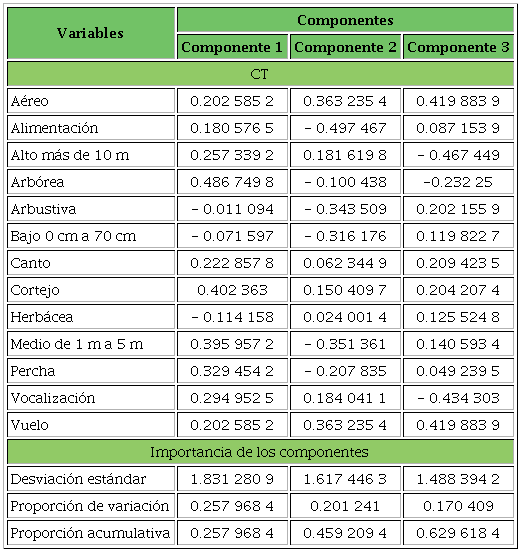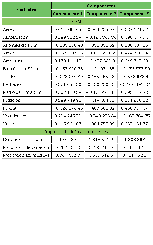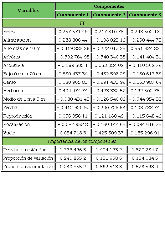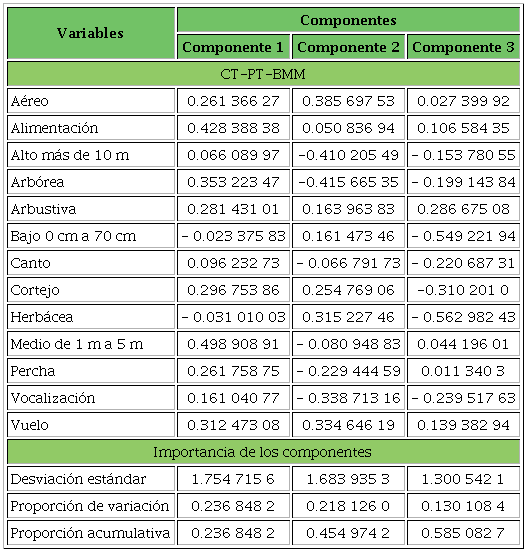 El ACP reportó una proporción de varianza acumulada en sus tres primeros ejes (componentes); de CT: 62.96 % (Tabla 7); PT: 52.65 % (Tabla 8); BMM: 71.17 % (Tabla 9); y CT-PT-BMM: 58.50 % (Tabla 10). En las tablas mencionadas y en la Figura 8, se explica la variabilidad presente entre las variables que conforman y determinan la incidencia y uso del hábitat y vegetación de las aves en los hábitats analizados. Se encontró mayor correlación del hábitat y vegetación empleado para la alimentación en el estrato herbáceo y arbóreo, en alturas de 5 m y 10 m, utilizando el estrato aéreo para vuelo. Dichos hallazgos han sido detectados anteriormente, señalando que estos hábitats también son empleados para la construcción de nidos, percha, refugio y desplazamiento (Sánchez y col., 2011; Velásquez y col., 2012; Ordóñez-Delgado y col., 2017; Alonso y col., 2018; Figueroa y col., 2019;Perez y col., 2021); no obstante, el presente trabajo es el primero en reportar especies bajo protección especial alimentándose en el estrato arbóreo de los SAF referidos; evidenciando cómo la estructura horizontal y vertical del hábitat en dichos medios de producción ha desarrollado cierta influencia en el arribo de especies migratorias y bajo cierto estatus de conservación, proporcionando recursos que permiten la coexistencia de estas especies. Lo último coincide con lo reportado por Sánchez (2017)y Medrano-Guzmán y col. (2020), quienes además hallaron especies migratorias haciendo uso del dosel para alimentación y como sitio de descanso. De igual manera, la relevancia del dosel es soportada por Sáenz y col. (2006) y Narango y col. (2019), quienes mencionaron que esta regula, para algunas especies, su dinámica y estructura poblacional, tal como se observó en ciertos individuos de Pionus senilis, los cuales se detectaron en el dosel perchando y algunos reproduciéndose. Se propone la implementación de buenas prácticas de manejo agroforestal que permitan la diversificación de estratos y sustratos como elementos del hábitat que coadyuven a la conservación de especies; de igual forma, cuidar el Bosque Mesófilo de Montaña y no permitir su degradación, para garantizar la coexistencia de especies con hábitos especialistas.