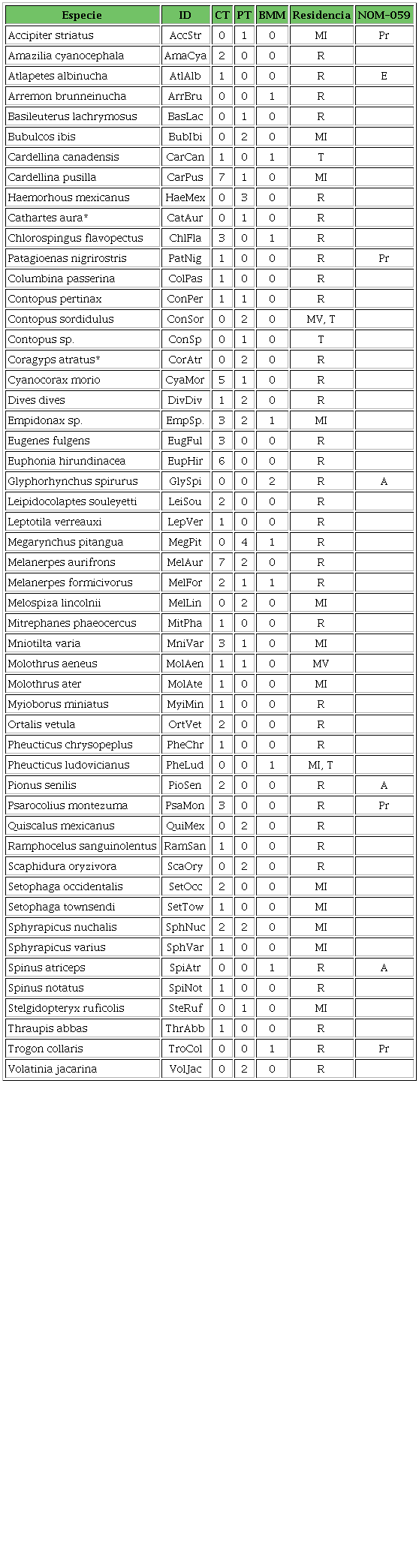 De acuerdo con la Norma Oficial Mexicana (SEMARNAT, 2010), se observó la presencia de 4 especies bajo protección especial: [Accipiter striatus (PT), Patagioenas nigrirostris (CT), Psarocolius Montezuma (CT) y Trogon collaris (BMM)]; una endémica: [Atlapetes albinucha (CT)], y tres amenazadas: [Glyphorhynchus spirurus (BMM), Pionus senilis (CT) y Spinus atriceps (BMM)]. Lo anterior, producto de la complejidad en la estructura y composición de los elementos que integran los hábitats analizados, considerando que a mayor tiempo de establecimiento, los SAF desarrollan características similares a espacios conservados, permitiendo el arribo de especies especialistas, quienes encuentran sitios de oportunidad en el interior de estos medios de producción, adoptando los recursos disponibles como parte de su nicho ecológico (Ramírez-Albores, 2010; Botero y De-la-Ossa, 2011; Cipriano-Anastasio y col., 2017;Naoki y col., 2017).