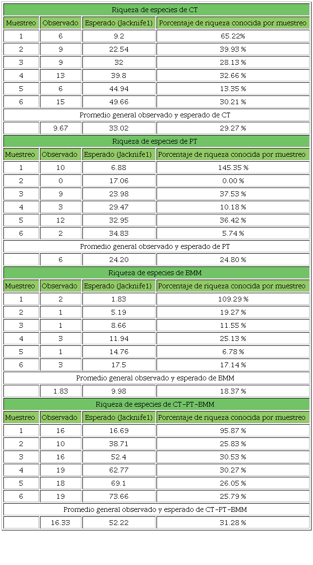 Los valores promedio observados de la riqueza de especies insectívoras fueron: CT: 9.67, PT: 6, BMM: 1.83 y CT-PT-BMM: 16.33. Por su parte, los resultados esperados mediante el estimador Jacknife1muestra medias de 33.02, 24.20, 9.98 y 52.22 especies, respectivamente. Por lo que, hasta ahora, con los valores de riqueza obtenidos, se conoce un promedio del 29.27 % (CT), 24.80 % (PT), 18.37 % (BMM) y 31.28 % (CT-PT-BMM), de la avifauna insectívora teóricamente presente en estos hábitats (Tabla 2).