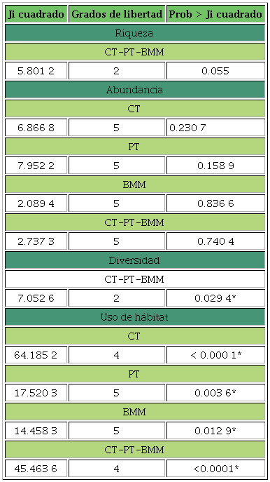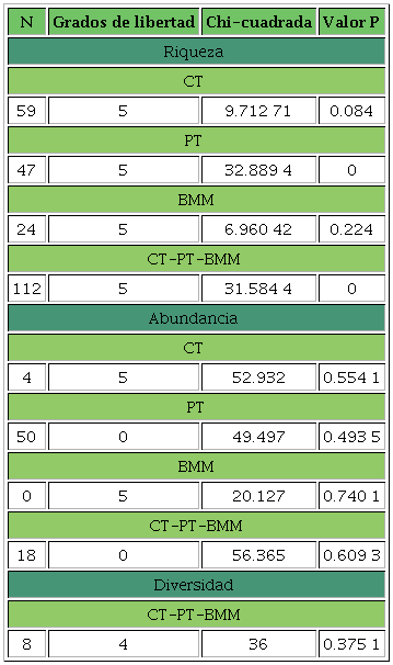 Los resultados de X2muestran que la riqueza de especies encontrada no es la que potencialmente se presenta en estos hábitats. Por su parte, la abundancia y diversidad es la que se distribuye en las áreas analizadas (Tabla 4).