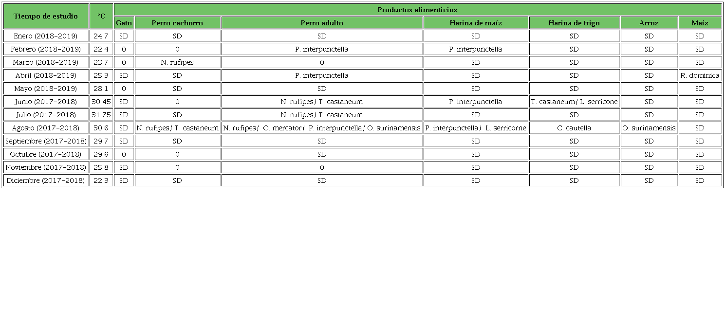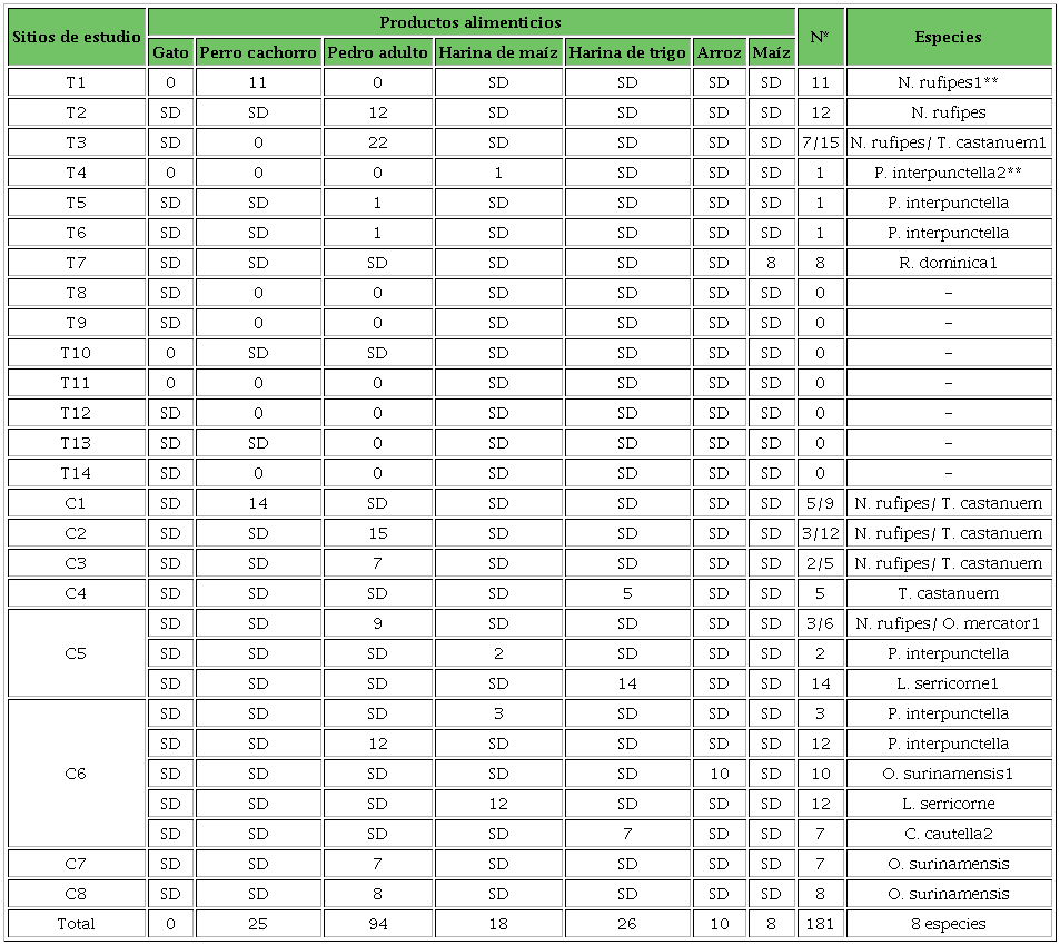 Las especies N. rufipes, T. castaneum y P. interpuntellase encontraron en la mayor cantidad de productos alimenticios y sitios de recolecta. Los estudios realizados en México muestran variaciones importantes en cuanto a las especies que invaden en mayor medida productos alimenticios almacenados; casualmente,T. castaneum fue la única especie que no varió dentro de estas observaciones (Wong-Corral y col., 1996; Córdova-Ballona y col., 2011), coincidiendo con los resultados de esta investigación. Por lo tanto,T. castaneum parece ser una plaga con alta presencia en productos almacenados en México.
