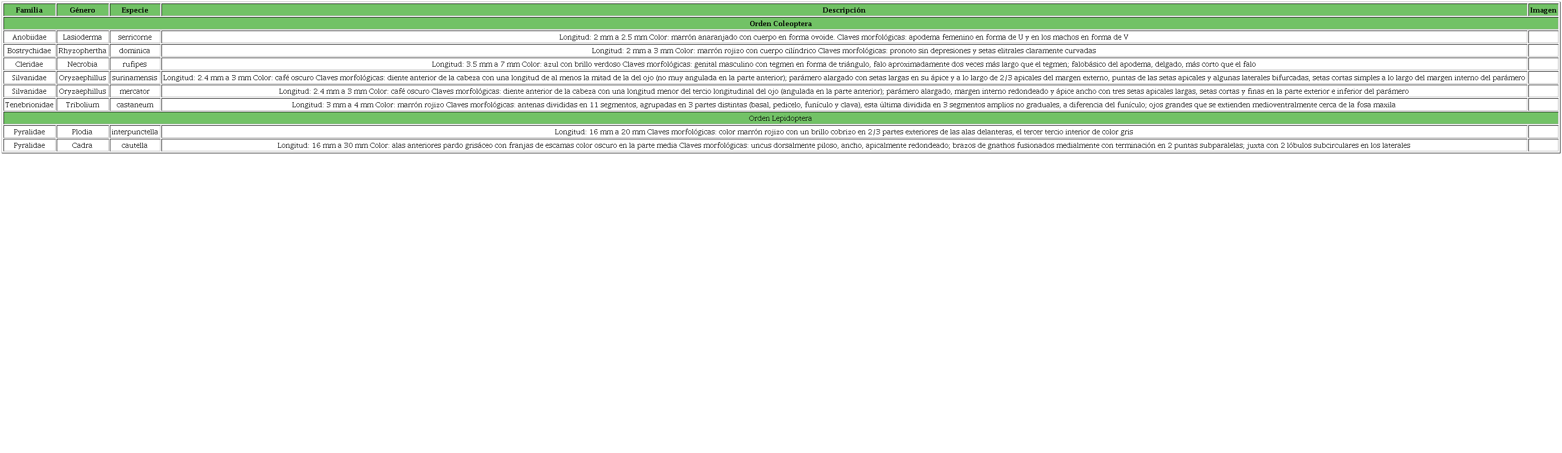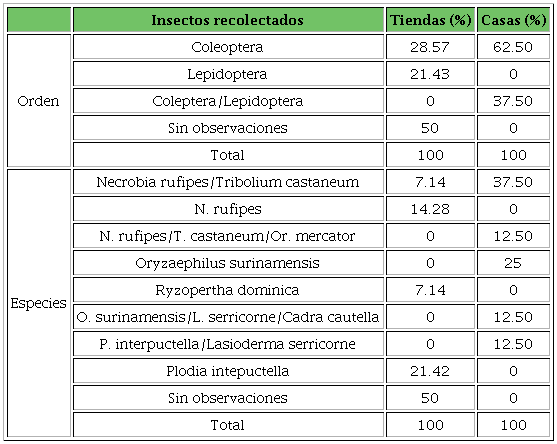 Se obtuvieron 181 ejemplares de insectos, clasificados en 2 órdenes: Coleoptera y Lepidoptera; 6 familias: Anobiidae, Tenbrionidae, Silvanidae, Cleridae, Bostrichidae y Pyralidae; 7 géneros: Lasioderma, Tribolium, Oryzaephillus, Necrobia, Rhyzophertha, Plodia y Cadra; y 8 especies: T. castaneum, O. surinamensis (L.), R. dominica (F.), L. serricorne, O. mercator, N. rufipes, P. interpunctella y C. cautella (Tablas 1 y 2). Las últimas 4 especies son nuevos registros del estado de Sinaloa.