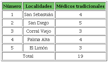 En las localidades que conformaron el área de estudio fueron entrevistados 19 médicos tradicionales (6 hombres y 13 mujeres) que practican la medicina ancestral y atienden a enfermos dentro y fuera de su localidad. Previamente se elaboró una guía que contenía los datos generales del entrevistado, forma de aprendizaje de sus conocimientos como curandero, diagnóstico, técnicas de curación y honorarios. El 74 % se asumió como Tének y 26 % como descendientes de este grupo indígena. Tres mujeres no hablaban español, por lo que durante las entrevistas se contó con la ayuda de un familiar como intérprete (Tabla 1).