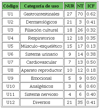 El ICF localizó 12 categorías, las cuales fueron determinadas con base en los padecimientos indicados por los médicos tradicionales (gastro-intestinales, dermatológicos, filiación cultural, respiratorios, músculo-esquelético, sistema urinario, cardiovascular, aparato reproductor femenino, emocional, analgésicos, sistema nervioso y de uso diverso). Los resultados indican que el empleo de estas plantas medicinales ayuda a la recuperación de la salud de las personas; en primer lugar, a quienes presentan síntomas de enfermedades gastrointestinales (ICF: 0.62), en segundo, a quienes sienten dolor (ICF: 060), y en tercero, a los que presentan enfermedades “emocionales” y cardiovasculares (ICF: 0.50), como se observa en la Tabla 7.
