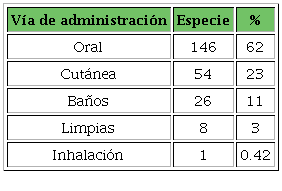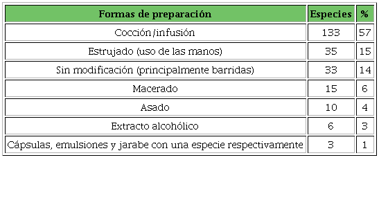 Sobre las formas de preparación, la más utilizada es la cocción, con el fin de ser usualmente ingeridas vía oral. Después, la maceración, para hacer cataplasmas; y el follaje, para baños medicinales al mezclarlo con agua (problemas en la piel). Las plantas cuyas hojas son asadas sirven para curar heridas o dolor de cabeza. Las utilizadas para elaborar extractos alcohólicos se emplean para curaciones relacionadas con daños en el sistema músculo esquelético. Las plantas sin modificaciones, para lidiar con los efectos corporales de la fiebre y la febrícula (Tabla 8). Además, existen 5 formas de administración de las plantas medicinales, como se expone en la Tabla 9.