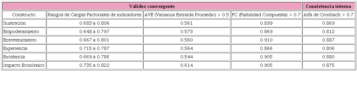 El tamaño de todas las cargas factoriales de los constructos se ubicó en un rango entre los valores 0.648 y 0.822, superior a la recomendación (> 0.6) de Bagozzi y Yi (1988). Los datos demostraron una alta consistencia interna en los constructos en cada caso. El alpha de Cronbach sobrepasó el valor de 0.70, de acuerdo con los estándares de Nunnally y Bernstein (1994). La FC se presentó arriba del valor crítico de 0.7, considerado como bueno (Hair y col., 2017). La AVE resultó superior a 0.50 (Fornell y Larcker, 1981) en todos los constructos, por lo que se pudo comprobar que el SEM es robusto, altamente válido y confiable (Tabla 1).