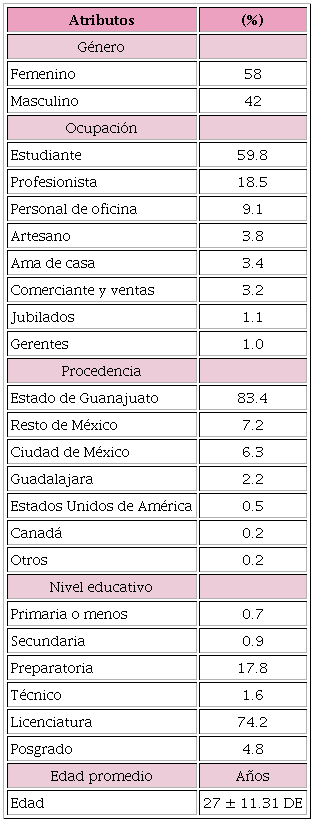 Los resultados sociodemográficos de la muestra se exponen en la Tabla 2, donde se reporta una mayor participación de mujeres (16 % más que hombres), con un promedio general de edad de 27 años (DE = 11.31); respecto a la ocupación, casi el 60 % son estudiantes, seguido de profesionistas (18.5 %), mientras que en el nivel educativo se observa un alto porcentaje con licenciatura o posgrado, casi el 80 %, lo que denota que el conjunto tiene un sesgo a ambas variables. Los datos reflejan que los asistentes al FIC tienen una baja representatividad para otros grupos según la procedencia, ya que el 8.5 % eran foráneos de dos metrópolis cercanas a Guanajuato (Ciudad de México y Guadalajara) y casi 1 % eran extranjeros (Estados Unidos de América y Canadá, principalmente) aunque a estos no se les preguntó si habían viajado expresamente al evento o aprovecharon su estadía en el país para atender al FIC.