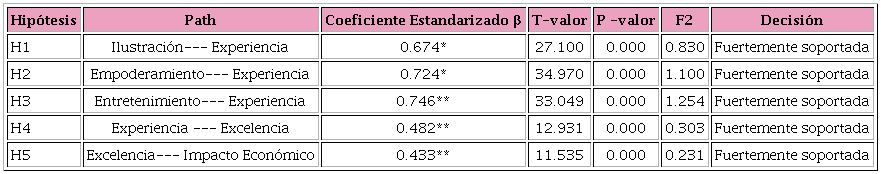 En esa tesitura, los resultados de esta investigación muestran la relación del constructo experiencia cultural del FIC con la ilustración, el empoderamiento y el entretenimiento, al mismo tiempo que con la excelencia, es decir, la calidad del servicio cultural, en este caso de los eventos artísticos, y en la percepción de los resultados económicos, mostrándose en la Figura 1. Los constructos se vieron fuertemente apoyados por los resultados de la aplicación de la prueba del Bootstrapping en el software Smart- PLS, que confirmaron que las pruebas T y el valor de P establecen que las relaciones entre ellos fueron de naturaleza positiva y altamente significativa, aprobando, por tanto, dichas relaciones entre los constructos o variables de análisis (Tabla 3).