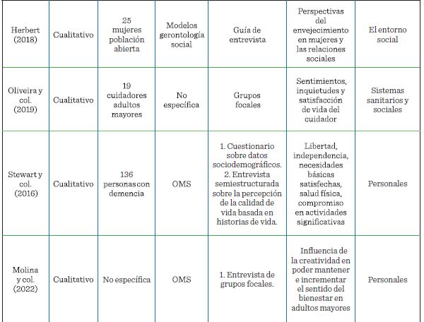 En la Tabla 3 se observan los estudios cualitativos con relación principalmente a factores personales y calidad de vida. En adultos mayores con demencia, los factores asociados fueron la libertad, la independencia, el tener necesidades básicas satisfechas, salud física, compromiso en actividades significativas y tranquilidad (Stewart y col., 2016). Atender estos aspectos en población adulta sana, les proporciona una percepción de empoderamiento (Tabatabaei y col., 2017). También son importantes las actividades significativas como el seguir aprendiendo cosas nuevas (Escarbajal-de-Haro y col., 2015) y el desarrollo de la creatividad (Molina y col., 2022). Por otro lado, los adultos mayores de población abierta con deterioro cognitivo relacionaron la calidad de vida con tener espiritualidad, que fue caracterizado por creer en algo superior (Chaves y Gil, 2015).