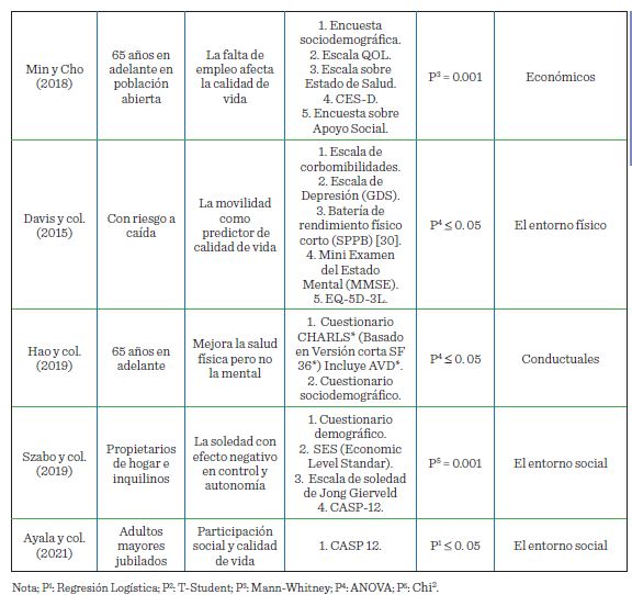 En relación al entorno social, se encontró que la participación del adulto mayor en el cuidado de crías o nietos (Ju y col., 2016), y el estar jubilados y seguir participando activamente (Ayala y col., 2021) como, por ejemplo, el seguir empleado (Min y Chon, 2018), mejoró la calidad de vida, a diferencia de quienes pasan mayor tiempo solos (Szabo y col., 2019). En factores del entorno físico, el tener mayor espacio de movilidad (Rantakokko y col., 2016) y fácil acceso (Davis y col., 2015) aumentaron la calidad de vida (Tabla 5).