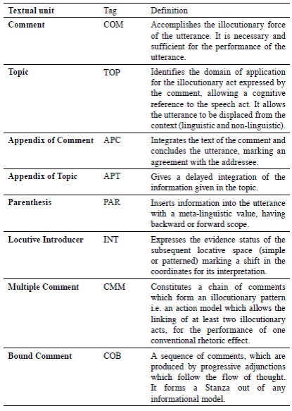 Informational units belong to two separate groups which fulfill either textual or dialogical functions. Textual function units compose the text of the utterance, while dialogical units are intended to address the listener in order to regulate the on-going interaction. Textual units are: Comment (COM), Multiple Comment (CMM), Bound Comment (COB), Appendix of Comment (APC), Topic (TOP), Appendix of Topic (APT), Locutive Introducer (INT) and Parenthesis (PAR). Dialogic units are: Allocutive (ALL), Conative (CNT), Discourse Connector (DCT), Expressive (EXP), Incipit (INP) and Phatic (PHA). Textual units will be presented in Table 1 below as they are the ones that are involved in the codification of verbal negation in Brazilian Portuguese. For fuller discussion and description of information units according to LAcT, see Moneglia & Raso (2014).