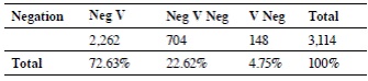 Through the extraction of all occurrences of verbal negation in the C-ORAL-BRASIL, we reached the distribution numbers by type presented in Table 2 below: