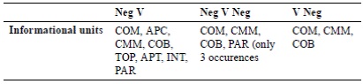 Summarizing the results found in our research, Table 3 below indicates the information units in which the three types of verbal negation can occur in Brazilian Portuguese: