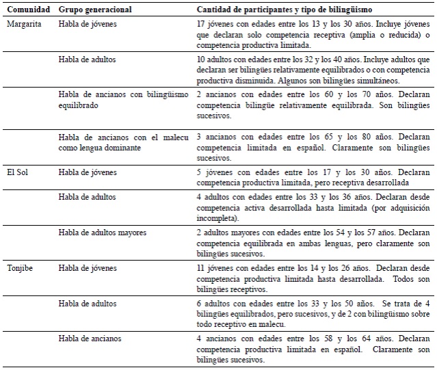 Como señalamos en Sánchez (2011) en cuanto a los perfiles sociolingüísticos por grupos generacionales, la terminología concerniente a los tipos de bilingüismo que empleamos describe de manera aproximada el momento de adquisición (bilingüismo equilibrado y bilingüismo subordinado con el malecu o el español como lengua dominante), según lo reportado por lo individuos.