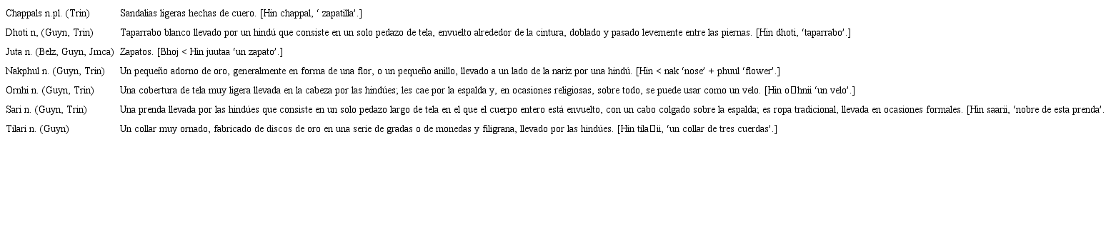 No obstante, aunque los hindúes se quedaron principalmente en las afueras de la sociedad criolla, su contribución lingüística al inglés caribeño es de máxima importancia, sobre todo con respecto al léxico inglés de Trinidad y Guyana, si no a la estructura, en las áreas de la comida, la ropa, los artículos domésticos, la religión, la joyería, etc.