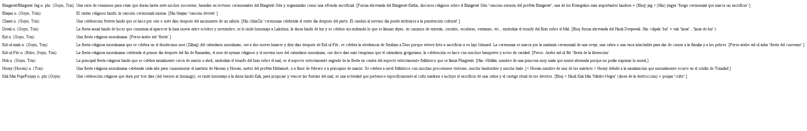 Las contribuciones hindúes al léxico del inglés caribeño son principalmente en las áreas de la comida, la ropa, y las fiestas religiosas y en otras esferas.