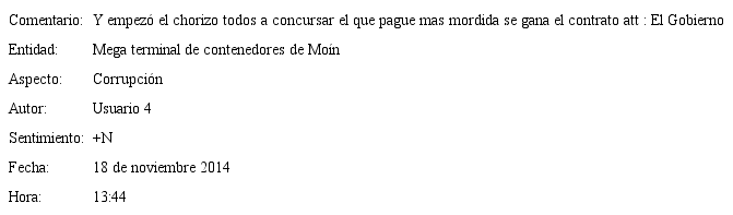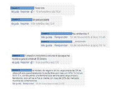 Para determinar claramente la entidad y el aspecto al que se refieren los comentarios también es necesario contemplar el comentario individual en su contexto. En este caso, el contexto parece ser la noticia original y los comentarios que la preceden, debido a que se trata un elemento inmediatamente consultable por un lector/usuario, al momento de emitir su opinión. Otro elemento que debemos considerar más adelante y que está mencionado en la literatura, es la posible alteración del sentido original de la expresión y la importancia del manejo de la negación como en (11).
