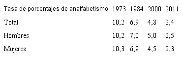 Para efectos del presente estudio, interesan particularmente los datos porcentuales de los indicadores analfabetismo, sin instrucción y primaria incompleta. Estos porcentajes, tomados del INEC (2012), se basan en los Censos de Población y Vivienda y definen el analfabetismo como “el porcentaje de personas menores de 10 años que no sabe leer ni escribir”, sin instrucción “personas con cero años de estudio”, primaria incompleta “personas con 1 a 5 años de estudio” y primaria completa “personas con 6 años de estudio”.