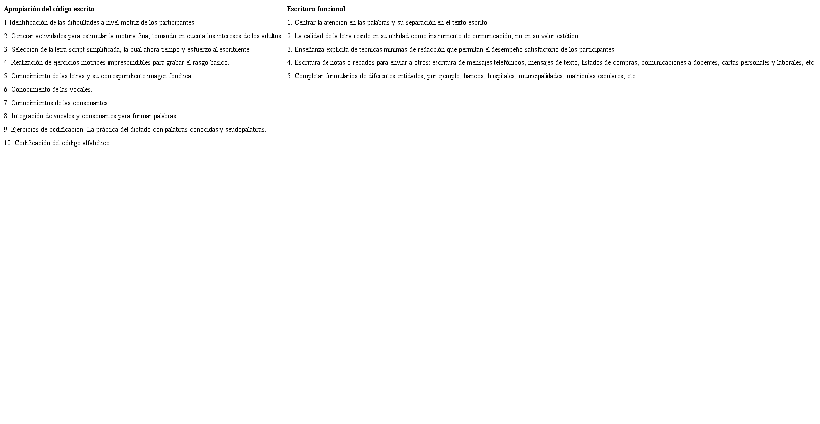Si bien la escritura se trabaja de forma graduada y simultánea con la lectura, para efectos de la alfabetización de adultos es conveniente visualizar los dos procesos por separado, el de codificación y el de decodificación, a fin de no correr el riesgo de invisibilizar el proceso de escritura.