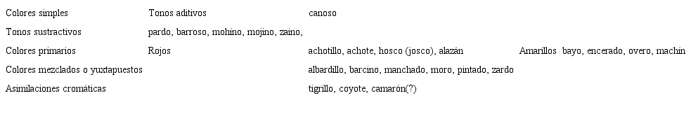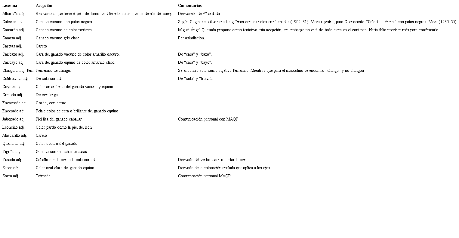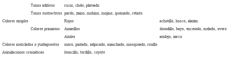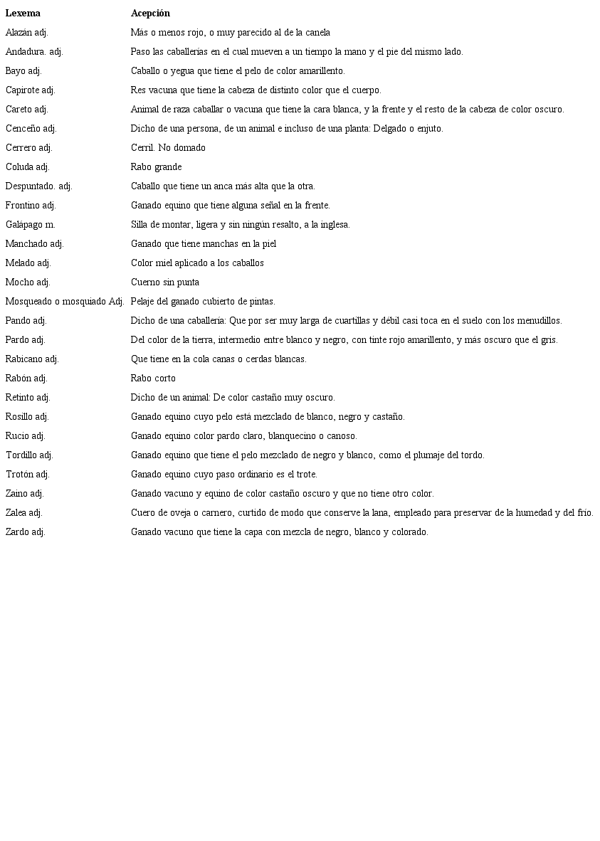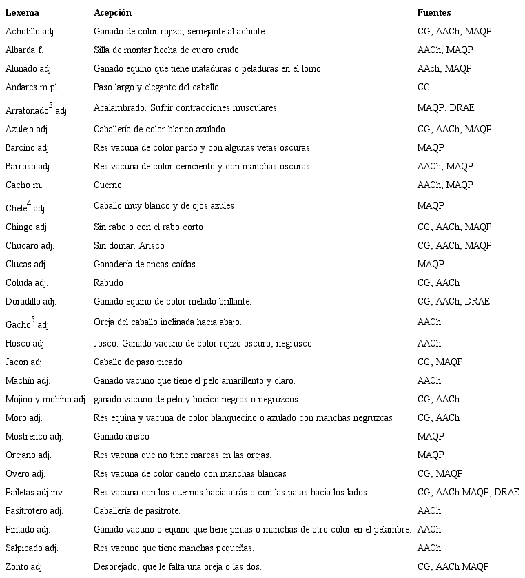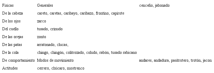 Para efectos de este análisis, de carácter bastante introductorio, se han escogido únicamente las lexías simples. En todo caso, las frases que podrían ser consideradas como lexías complejas son, en general, descripciones relativamente de uso común, por ejemplo “con un lucero en la frente”, “con faja blanca en el hocico”, “con apariencias de forastero” o “pescuezo tieso”.