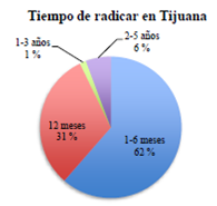 En la Figura 2.4, se presenta el tiempo que los migrantes tienen viviendo en Tijuana. El 62 % tienen de radicar en la ciudad de 1 a 6 meses, el 31 % alrededor de 12 meses, el 6 % de 2 a 5 años y el 1 % de 1 a 3 años. Lo que indica que en el porcentaje más alto se centra en aquellos residentes haitianos y centroamericanos, dentro de estos, el menor porcentaje de los encuestados se reserva para los migrantes mexicanos.