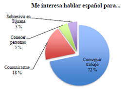 Por otro lado, es necesario potencializar el papel que juega el español para extranjeros en los migrantes haitianos, debido a que dominar esta lengua les permitirá tener mejoramiento económico, social y cultural. Lo anterior se ve reflejado en la Figura 2.6, donde el 72 % de los migrantes desea conseguir un trabajo a través de un mejor dominio de la lengua; un 18 %, comunicarse y tener un mejor entendimiento con los ciudadanos de la frontera; un 5 %, conocer personas con el fin de establecer relaciones sentimentales; y el 5 %, sobrevivir en la ciudad para conseguir una residencia temporal hasta llegar a una residencia permanente.