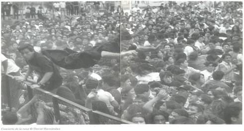 La imagen nos recuerda la referencia constante de Monsiváis a la gran cantidad de población que se ha afincado en el entonces Distrito Federal, producto de la migración interna en busca de mejores condiciones de vida. Asimismo, se destaca un joven brincándose una baranda y otro en el aire, lo cual es muestra del mosh o baile que se desarrolla por parte de los jóvenes, principalmente cuando la música es punk o de algún estilo subcultural (Hebdige, 2004; Britto, 1991). Se pone de manifiesto que para Monsiváis, muchos de los elementos subculturales y contraculturales han sido cooptados por el consumo, a pesar de que “la música, la escena que recrea y enamora, conspira a cielo abierto y se ve representada en la historia del rock, las grabaciones de grupos que aún no acceden al disco” (p. 123). Contraposición clara del avance tecnológico y las posibilidades económicas.