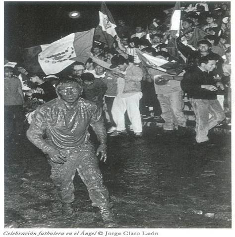 Aunado a ello, las celebraciones de los partidos de la Selección Mexicana de Fútbol en Estados Unidos 1994 reviven también la visión nacionalista y la mediatización de la vida a través del espectáculo. Al igual que con lo religioso, la Celebración futbolera en el Ángel expresa la necesidad del pueblo de liberarse de las represiones y de la vida que está demarcada por el malestar en la cultura (ver Imagen 10). En la foto, un grupo de jóvenes se muestran con insignias del Tri, bañados en lodo.