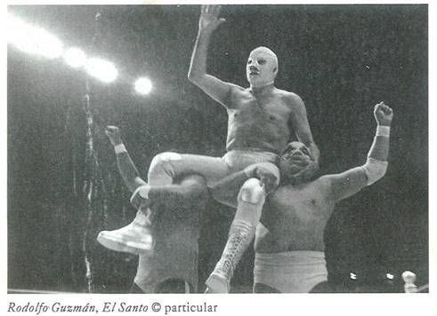 Rodolfo Guzmán, El Santo (ver Imagen 5) recoge la elaboración de un mito urbano: “el Santo: [es] una fábula realista de nuestra cultura urbana; una vida profesional cuya primera razón de ser fue la carencia de rostro; una fama sin rasgos faciales a los cuales adherirse” (p. 133). La lucha libre es una actividad por medio de la cual las clases populares ven una promesa de ascenso y esta se nos recuerda en la imagen de El Santo, al ser llevado en hombros: