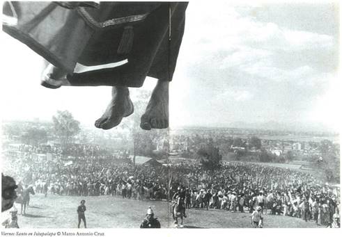 En relación con la tónica de la transgresión, Vienes Santo en Iztapalapa nos recuerda la muerte de Jesús, pero también el ahorcamiento de Judas, visible en los pies de un hombre que ha sido colgado (ver Imagen 7). No debe obviarse la escenificación que anualmente se realiza en Iztapalapa de la pasión y la asistencia de multitudes, con lo que se expresa, nuevamente, la visión demográfica y el crecimiento de la ciudad, lo religioso y la traición; y, por qué no, lo diferente, lo Otro.