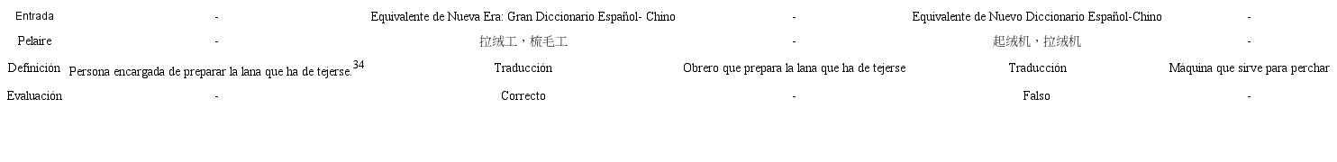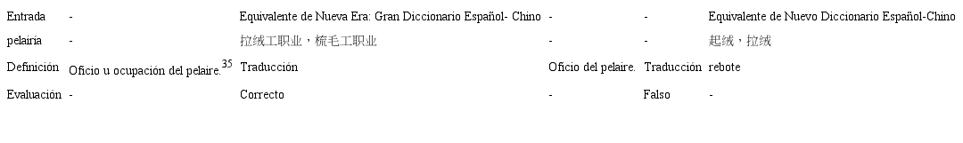En lo que respecta a pelaire, se observa una diferencia obvia en los equivalentes proporcionados, pues uno se refiere a los trabajadores, mientras que el otro, a la máquina (Tabla 9). No resulta difícil determinar que aquí el equivalente de Nueva Era es más adecuado, tomando como referencia la definición ofrecida por el Diccionario de la Lengua Española.