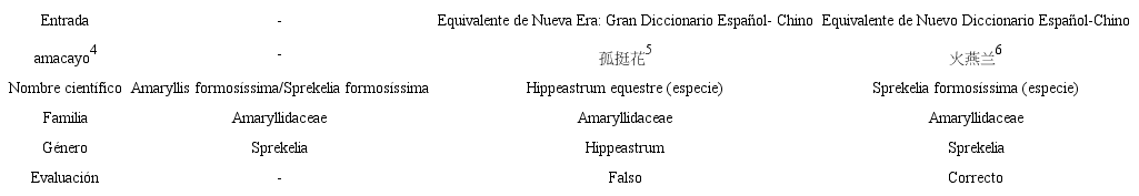 Según la Tabla 1, se puede constatar que el equivalente ofrecido por ND es el correcto, dado que las informaciones científicas (nombre científico, familia, género) de este corresponden con las de amacayo. Mientras tanto, la especie a la que se refiere el equivalente de Nueva Era y amacayo pertenecen a una misma familia pero a un género distinto.
