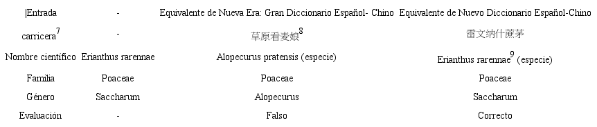 Algo similar al caso anterior ocurre con el término carricera (Tabla 2). Las informaciones científicas del equivalente ofrecido por ND corresponden con las de carricera. El equivalente de Nueva Era se refiere a una especie que pertenece también a la familia Poaceae, pero a un género distinto.