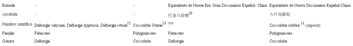 Esta divergencia se ve reflejada en los dos diccionarios bilingües. El equivalente ofrecido por ND corresponde con una especie del género Coccoloba. En cuanto al equivalente dado por Nueva Era, no se ha encontrado la información científica correspondiente, pero se deduce que se refiere a una especie de Dalbergia, puesto que este equivalente tiene como significado ‘Dalbergia de Panamá’.