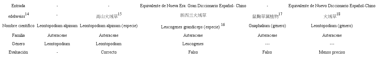 El caso de edelweiss muestra cierta particularidad, ya que en Nueva Era se ofrecen tres equivalentes (Tabla 4). Sin embargo, la cantidad no garantiza la calidad del equivalente, como se evidencia en el cuadro 5, los tres equivalentes proporcionados no corresponden a un mismo nivel en la clasificación taxonómica, pues los primeros dos corresponden a especies, y, el último, a género. Los tres se refieren a plantas de la familia Asteraceae, pero solo el nombre científico del primero es igual que el de edelweiss. En lo que respecta al ND, el equivalente dado corresponde al género de edelweiss, por lo tanto, no es falso, pero es menos preciso.