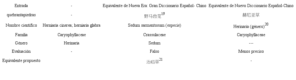 La voz quebrantapiedras es otro caso que muestra el problema de equivalentes de Nueva Era (Tabla 5), pues ni el nombre científico ni la clasificación taxonómica de este equivalente es igual que las informaciones botánicas de quebrantapiedras. En lo que atañe al ND, el equivalente ofrecido, que se refiere al género Herinaria de la clasificación taxonómica, es más razonable que el de Nueva Era, a pesar de que no corresponde de manera exacta con quebrantapiedras, que se trata de una especie de Herinaria.