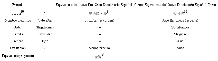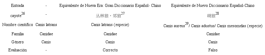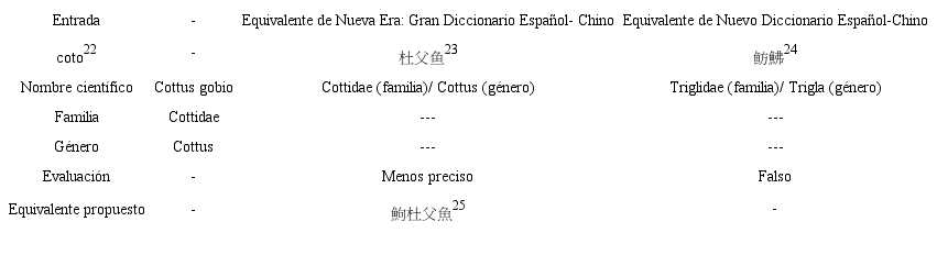 En el caso de coto, tanto el equivalente de Nueva Era como el de ND pueden referirse a una familia y a un género de pez al mismo tiempo (Tabla 6). Por ejemplo, el equivalente hallado en Nueva Era杜父鱼presenta dos posibles interpretaciones implícitamente: 杜父鱼科(Cottidae) y 杜父鱼属 (Cottus). Resulta necesario añadir cierta indicación para señalar a qué nivel de la clasificación taxonómica el equivalente ofrecido corresponde concretamente.