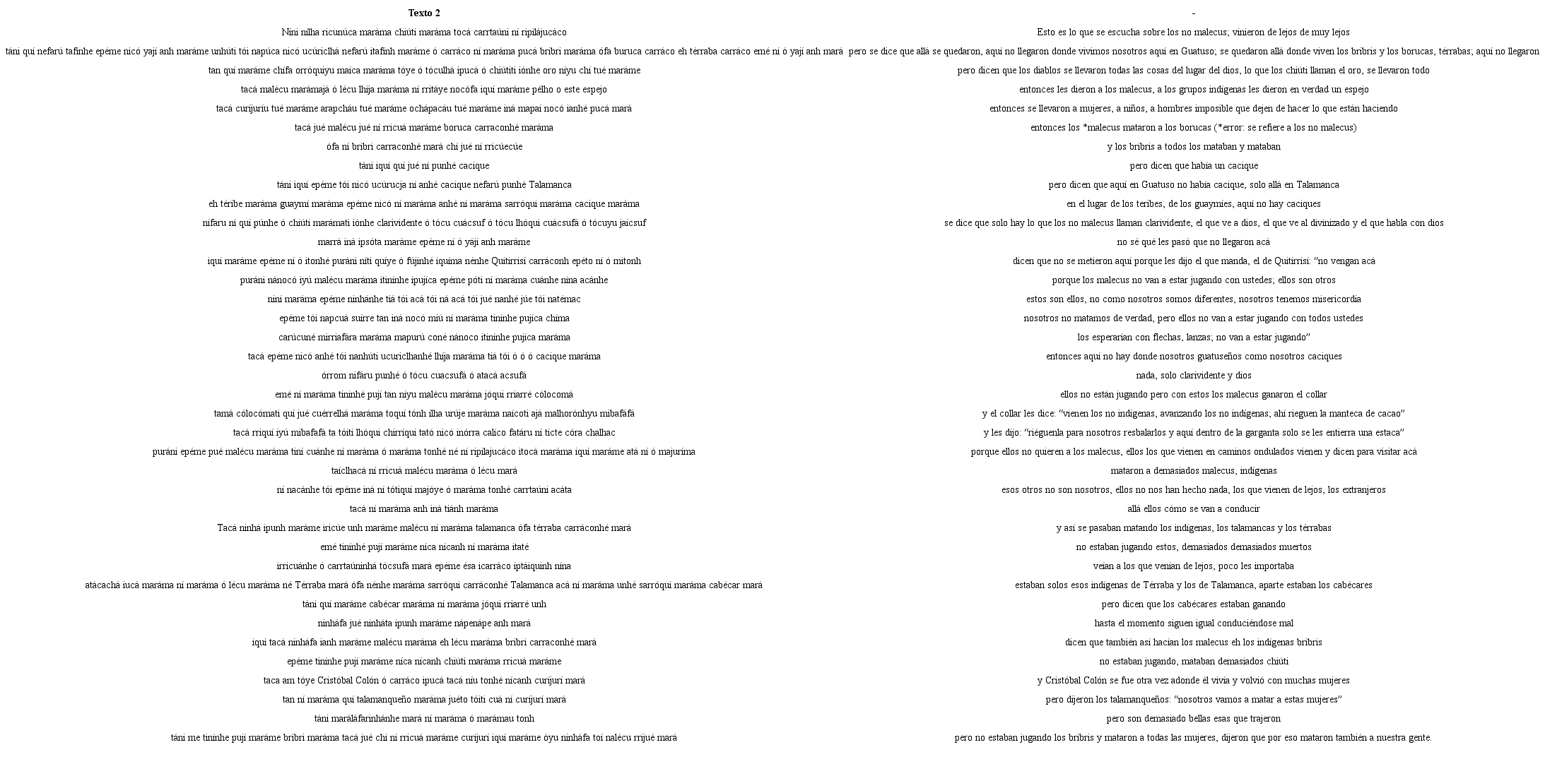 Debe destacarse que ambos textos se insertarían en el macrogénero textual malecu de los mausírrajáca maráma ‘conversaciones’, en el cual se incluyen las conversaciones sobre cualquier tema personal o grupal y las conversaciones sobre temas de trascendencia cultural, llamadas estas últimas maracunúca maráma ‘lo que se ha escuchado’, género que engloba las narraciones y las descripciones transmitidas por tradición y que gozan de un aprecio especial (Constenla, 1996).
