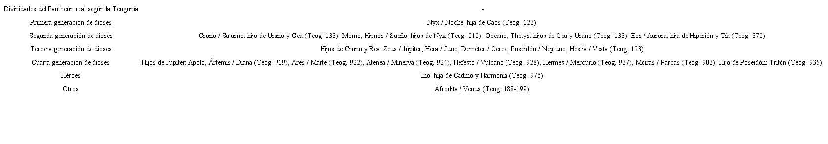 Las 39 divinidades incluidas en el Pantheón real tienen distintas procedencias. La mayoría de ellas son las griegas (posteriormente asimiladas a las romanas), las cuales se mencionan en la Teogonía de Hesíodo, poeta épico griego del siglo VIII a. C. Este autor es considerado, junto con Homero, padre y precursor de la mitología griega y es, por consiguiente, un referente mitológico de la Antigüedad. La Tabla 1 muestra la distribución de los dioses mencionados en el Pantheón real de acuerdo con la organización de la obra de Hesíodo. Cabe aclarar que Dighero utiliza siempre los nombres romanos; en la Tabla 1 aparece tanto el nombre griego como el romano.