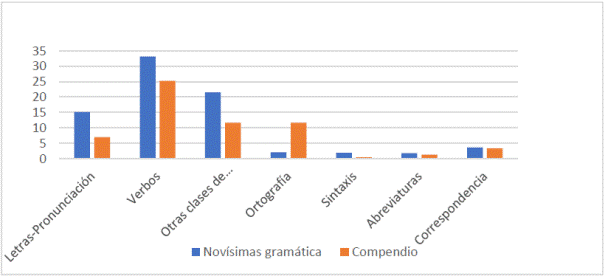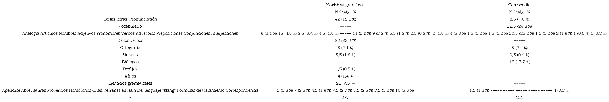 En la Novísima gramática se altera la estructura del Compendio: la segunda parte de la obra se dedica íntegramente al verbo (33,2 % del total), reproduciendo, aunque en ocasiones añadidos y ampliados, los contenidos del Compendio (sobre todo en lo relativo a los modelos de conjugación de verbos). La tercera parte, con el título “De la analogía”, presenta el resto de categorías gramaticales con idéntica estructura y concepción que en el Compendio, si bien el desarrollo en las definiciones, ejemplos y usos son, muchas veces, considerables (Tabla 3).